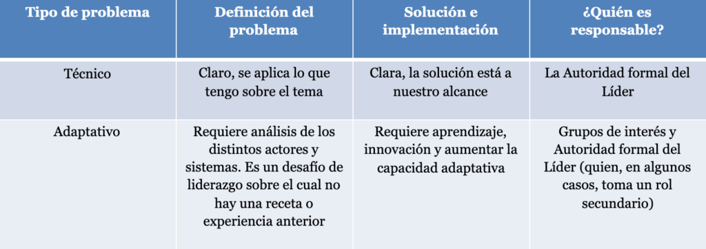 Este autor propone que los desafíos que los Líderes enfrentan no se tratan de cuestiones técnicas, sino adaptativas y realiza una comparación entre ambos tipos de problemas: