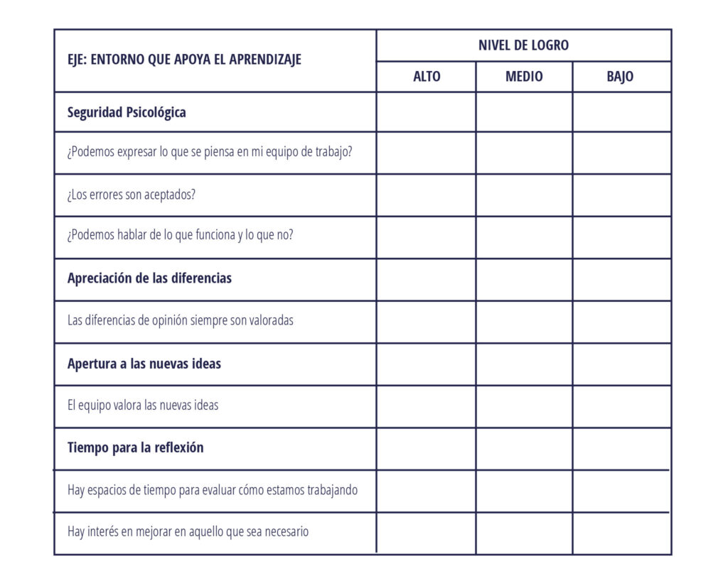 - Un entorno que apoye el aprendizaje (seguridad psicológica, diversidad de ideas, apreciación de diferencias, tiempo para la reflexión)