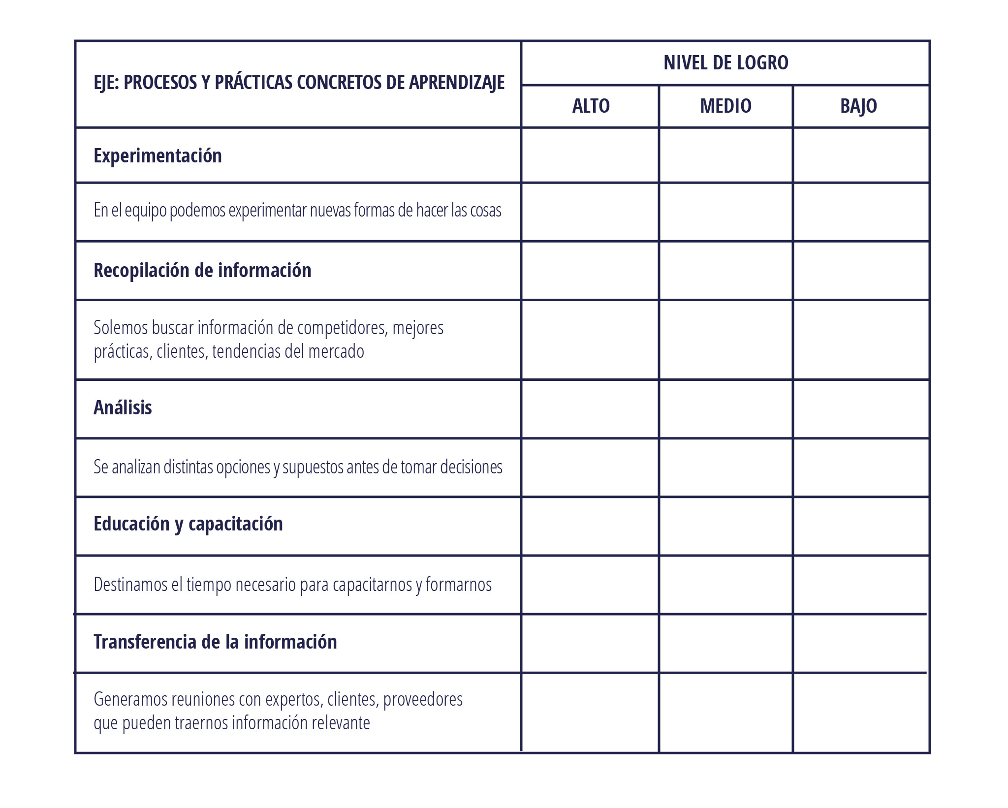 - Procesos y prácticas concretas de aprendizaje (cuáles son los pasos y acciones para que una organización aprenda)
